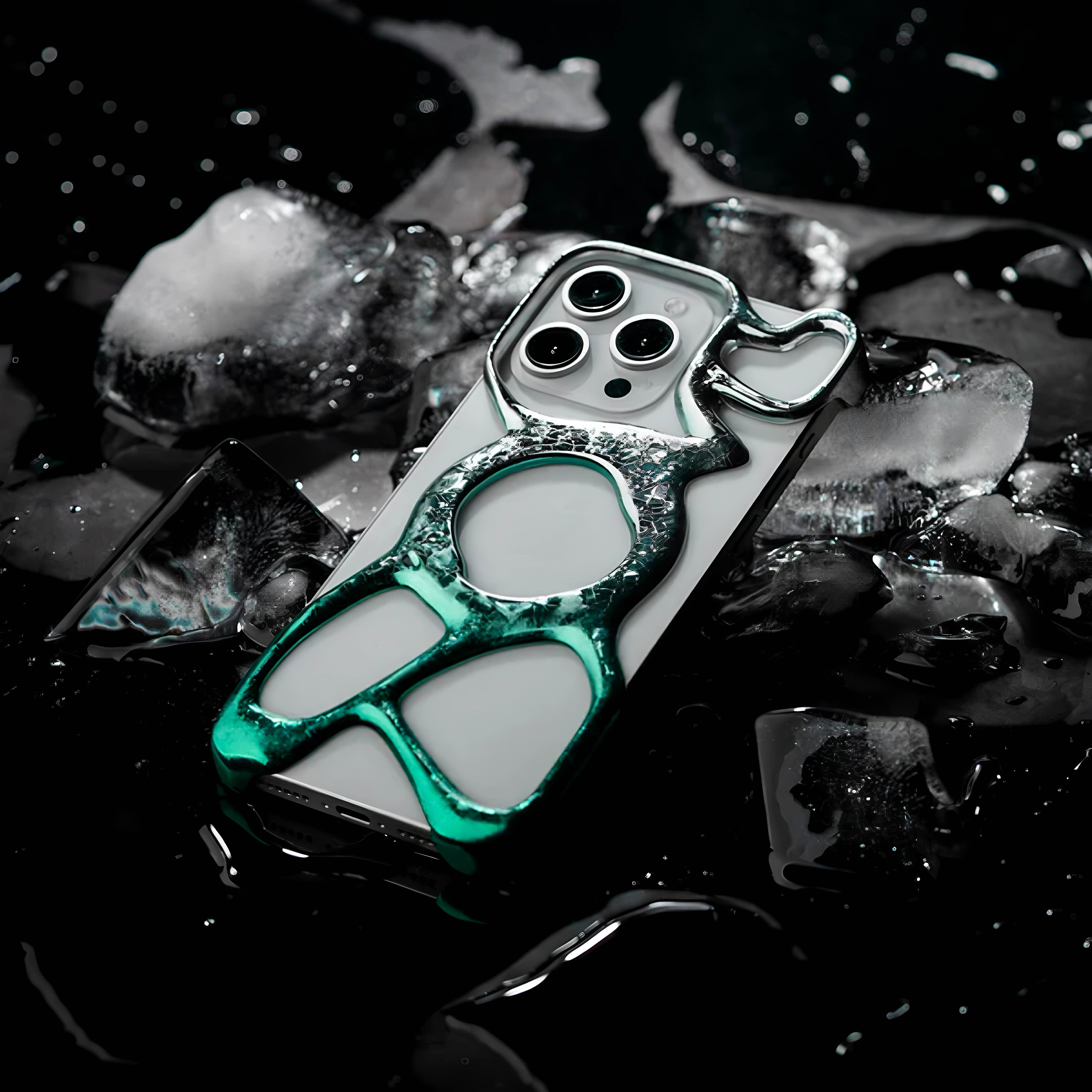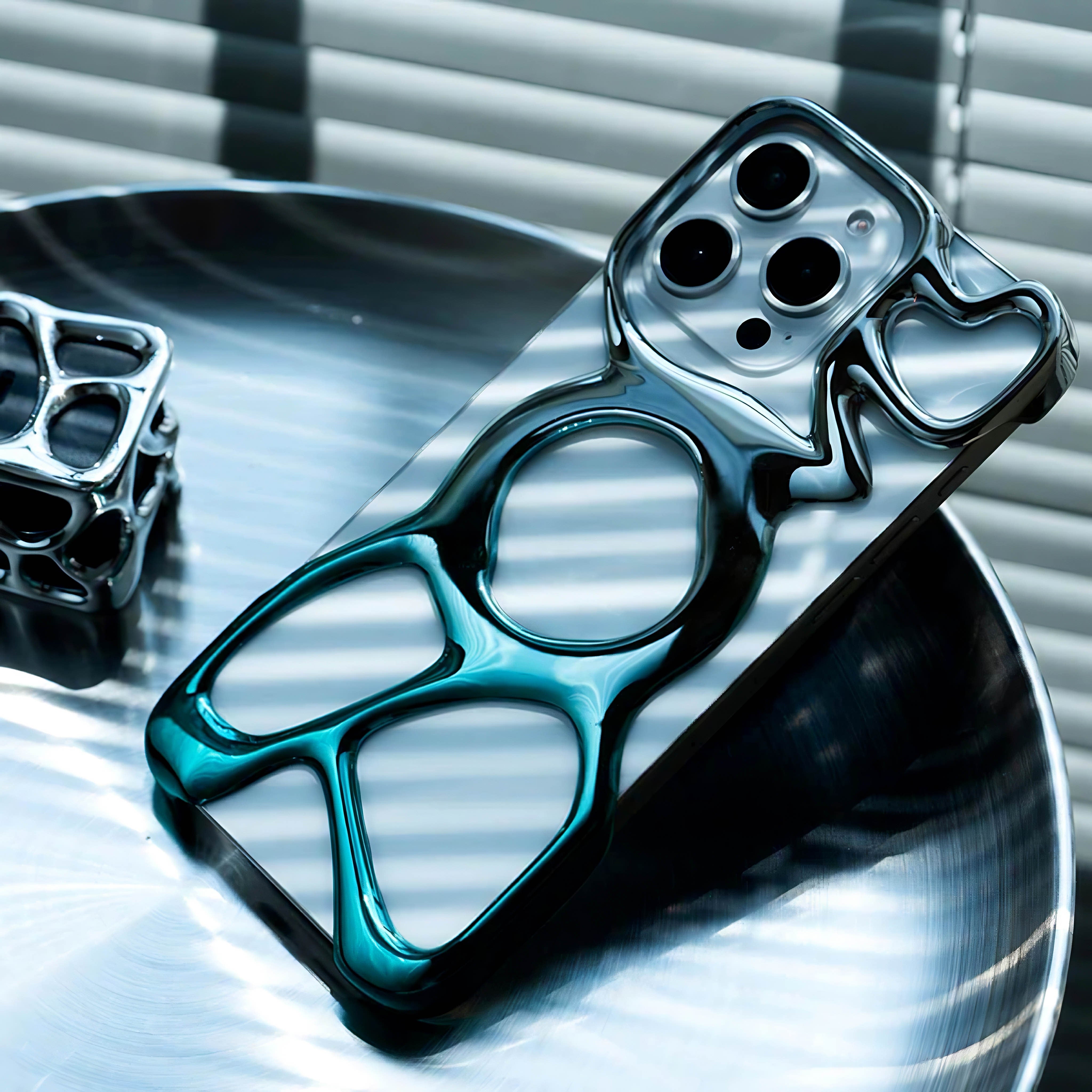 Sculpted chrome forms that do not look or feel like a flat case.